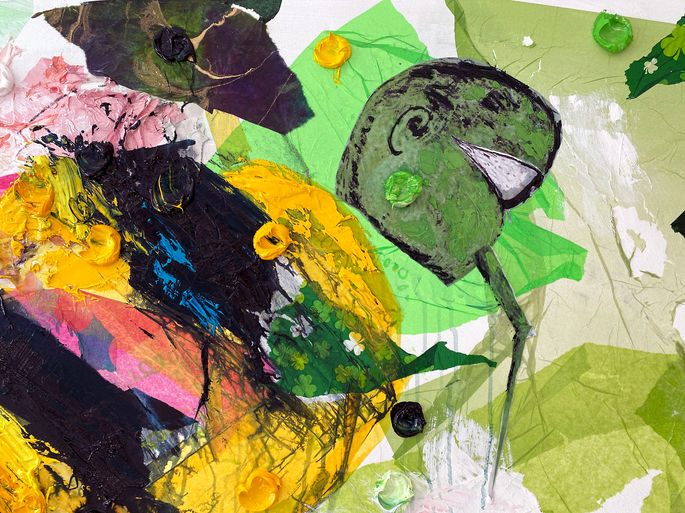 "Bad Breaking Phil 1". 2022. 60 x 96 inches. Mixed media on canvas (Oil, acrylic, graphite, tile adhesive, and tissue paper).
