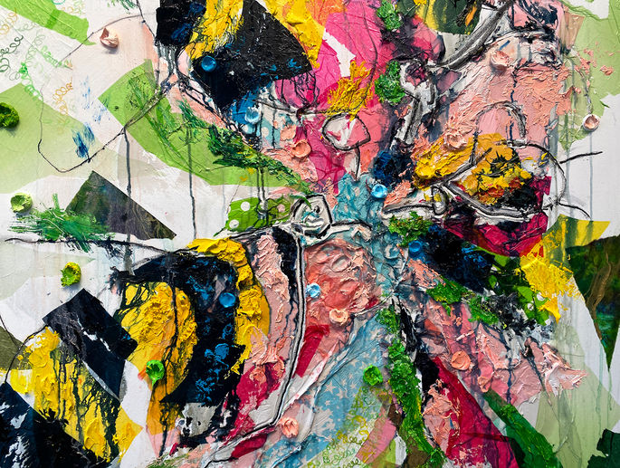 "Spring Break 8". 2022. 60 x 96 inches. Diptych. Mixed media on canvas (Oil, acrylic, graphite, tile adhesive, and tissue paper).